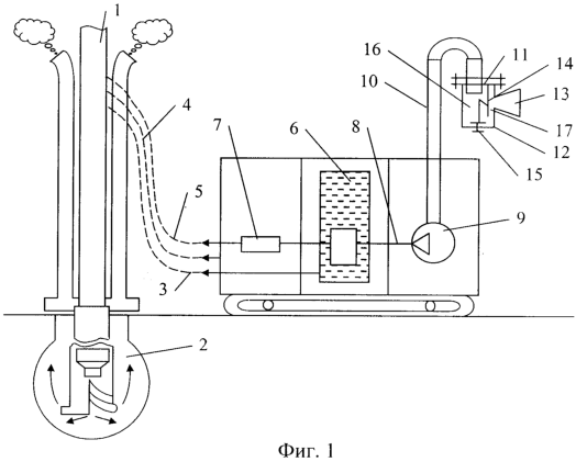 Специфика эксплуатации устройств для термомеханического бурения обусловлена наличием в окружающем атмосферном воздухе значительного количества капле- и пароструйной влаги, которая при работе компрессора 9 поступает через суживающееся сопло 13 в корпус с днищем 12 конической формы фильтра 11. На выходе из суживающегося сопла 12 поток всасываемого воздуха с технологической и атмосферной влагой внезапно расширяется в камере 16 и ударяется об отражатель 14. В результате часть влаги падает в днище 12 конической формы для последующего удаления через конденсатоотводчик 15, а движущийся поток огибает отражатель 14 и поступает во внутреннюю камеру 17, далее по всасывающему патрубку 10 очищенный от каплеструйной влаги всасываемый воздух поступает в компрессор 9, откуда после сжатия через бак-теплообменник 6 и адсорбер 7 по нагнетательному патрубку 8 магистрали 5 направляется по буровому ставу 1 к соплам огнеструйной горелки 2, обеспечивая наряду с поступлением туда же топлива по магистрали 3 процесс термического разрушения горных пород.