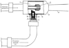 Устройство монтируется на устьевую арматуру при помощи быстросъемного разъемного соединения (БРС) и состоит из эжекторного устройства и обратного клапана. Эжекторное устройство включает в себя приемную камеру 1, корпус 2, активное сопло 3, пассивное сопло 4, диффузор 5, а обратный клапан 6 содержит седло клапана 7 с шариком 8 и стопорный штифт 9.