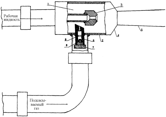 Устье скважины оснащенной УЭЦН оборудуют эжекторным устройством. При работе ЭЦН добываемая жидкость, имея значительную скорость, направляется через активное сопло 3, создает в приемной камере 1 зону пониженного давления, вызывающую открытие обратного клапана 6, в результате чего шарик 8 отходит от седла клапана 7 и нефтяной газ из затрубья, смешиваясь с добываемой жидкостью, выбрасывается через диффузор 5 в линию, обеспечивая непрерывную принудительную откачку. Обратный клапан 6 предотвращает попадание добываемой жидкости обратно в скважину при остановках ЭЦН. Стопорный штифт 9 не дает возможность шарику 8 закупорить выходное отверстие обратного клапана 6 при больших расходах нефтяного газа. Седло 7 обратного клапана 6 изготовлено съемным для проведения ревизии при ремонтах.