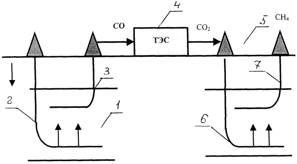 Способ осуществляют следующим образом. Подземную газификацию залежи ведут по традиционной технологии 1, для этого в скважину 2 нагнетают воздушно-кислородное дутье, осуществляют процесс газифицирования и образовавшийся газовый поток с высокой теплотворной способностью отводят через скважину 3 на теплоэлектростанцию 4 по газопроводу. На теплоэлектростанции газовый поток подают в газовую турбину, которая совместно с паровой турбиной приводит в действие электрогенератор. Электроэнергия от генератора по линии электропередачи подается потребителям, а продукт окисления – углекислый газ направляют на следующую ступень 5 – в качестве интенсификатора для извлечения метана из угольной залежи, преимущество которого состоит в том, что поступление углекислого газа снижает связывание добываемого метана с углем, благодаря чему используемый для создания давления газообразный углекислый газ одновременно способствует увеличению добычи метана.