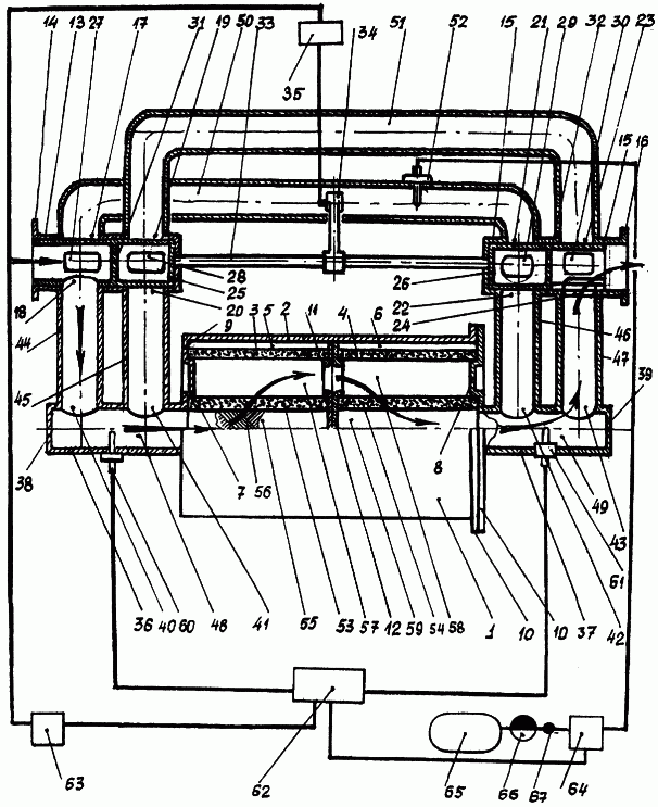 В полость 48 впускной трубы 36 и в полость 49 выпускной трубы 37 введены датчики давления 60 и 61. Для регистрации разницы давления в полостях 48 и 49 нейтрализатор оборудован микропроцессором 62, соединенным с датчиками давления 60 и 61 и преобразователями импульсов 63 и 64.