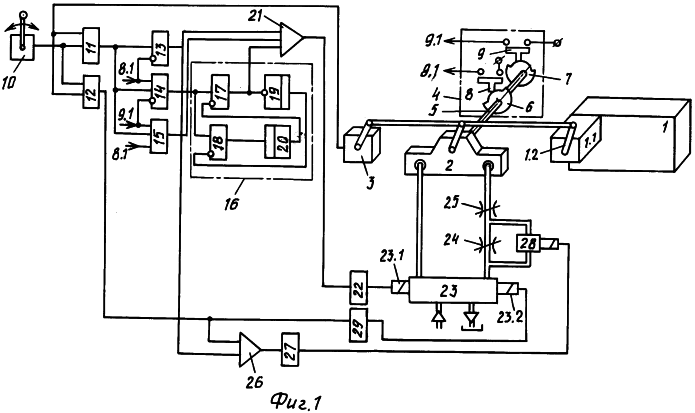 Сигнал с выхода элемента И 14 через элемент И 17 поступает через элемент ИЛИ 21 и усилитель 22 на электромагнит 23.1 преобразователя 23. Сигнал с выхода И 17 также поступает на инверсный вход элемента задержки времени 19, снимая сигнал с его выхода, при этом появляется сигнал на выходе И 18. Сигнал с выхода И 18 поступает на вход элемента задержки времени 20. После появления (с задержкой) сигнала на выходе элемента 20 он блокирует элемент И 17, снимая сигнал (с задержкой) с выхода элемента 19.