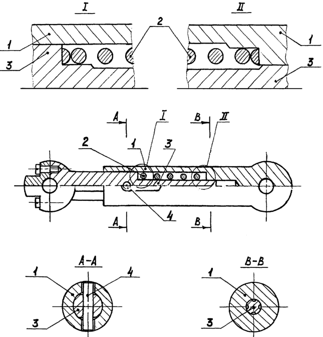 Конструкция шатуна переменной длины с использованием аккумулирующей винтовой цилиндрической пружины сжатия переменного шага представлена на чертеже. В корпус 1, представляющий собой симметричную ступенчатую трубчатую монолитную деталь с узлом подсоединения к поршню, входит по двум ступенчато расположенным направляющим диаметрам ступенчатый центрирующий шток 3 в виде цельной монолитной детали с узлом подсоединения к коленчатому валу. Шток 3 центрирует меньшим направляющим диаметром винтовую цилиндрическую пружину сжатия переменного шага 2 по внутреннему диаметру и предварительно поджимает ее вдоль оси со стороны одного торца. Пружина 2, которая находится в полости большего направляющего диаметра корпуса 1, поджимается и центрируется по наружному диаметру со стороны другого торца элементом для центрирования пружины, расположенным между двумя направляющими диаметрами внутри корпуса 1. Конструкцию шатуна в сборе удерживает штифтовой фиксатор 4, жестко установленный в сквозное и перпендикулярное к оси шатуна отверстие штока 3 через сквозной замкнутый продольный паз корпуса 1 и обеспечивающий в пределах продольного паза свободное осевое перемещение штока 3 в корпусе 1 при изменении длины шатуна в работе.
