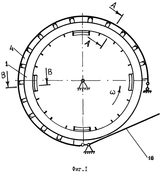 На фиг.1 показан фрагмент ленточно-колодочного тормоза с системой термоэлектрического охлаждения; на фиг.2 – поперечный разрез по А-А (пары трения с термобатареями-термоэлектрогенераторами) фиг.1; на фиг.3 – поперечный разрез по В-В (пары трения с термобатареями-термоэлектрохоло-дильниками) фиг.1; на фиг.4 и 5 – схемы работы термобатарей в режимах термоэлектрогенераторов и термоэлектрохолодильников.