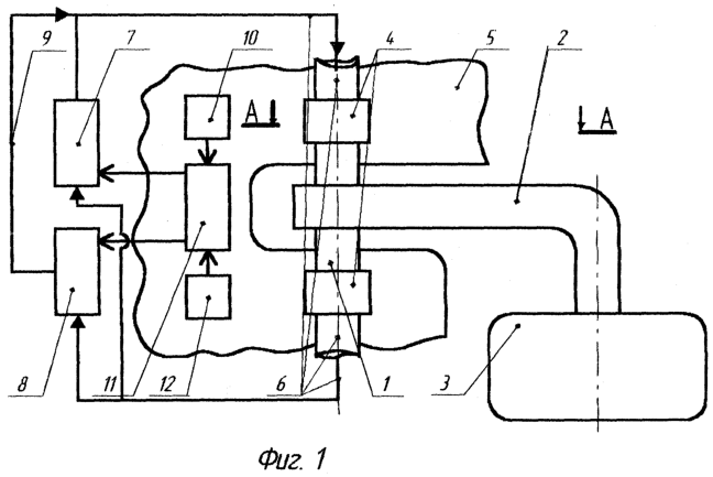 Контур нагрева 7, контур охлаждения 8, обводная магистраль 9, датчик вибрации 10 установлены на автомобиле и соединены с блоком управления 11 и источником питания 12.