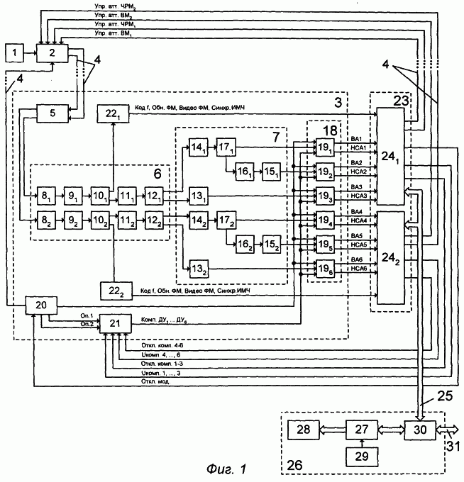 Принятые антенной 1 радиолокационные сигналы поступают через делитель 34 мощности (см. фиг.2) на фильтр 35 нижних частот и фильтр 36 верхних частот, которые разделяют сигналы по частоте на два канала приема: от 8 ГГц и ниже и от 8 ГГц и выше. В каждом из частотных каналов сигналы поступают на ограничители 371, (372), которые осуществляют защиту малошумящих усилителей при приеме сильных сигналов. Далее сигналы поступают на управляемые аттенюаторы 381 (382), обеспечивающие при поступлении команд “Упр.атт.ВМ1”, “Упр.атт.ВМ2” ослабление сигналов на величину порядка 20 ДБ.
