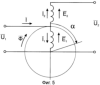 Аксиальный индукционный регулятор работает следующим образом. При подключении первичной трехфазной обмотки 2 поворотного тороидального магнитопровода 1 к питающей сети напряжением U1 в воздушном зазоре аксиального индукционного регулятора создается вращающееся магнитное поле, которое, взаимодействуя с вторичной трехфазной обмоткой 5 неподвижного тороидального магнитопровода 4, наводит в ней систему ЭДС. При пространственном совпадении осей обмоток 2 и 5 соответственно поворотного 1 и неподвижного 4 тороидальных магнитопроводов магнитный поток (см. фиг.5) одновременно набегает на обмотки 2 и 5 и наводит в них ЭДС и совпадающие по фазе и одинаково направленные относительно обмоток. При этом вектор ЭДС действует согласно с вектором напряжения Поэтому напряжение U2 (см. фиг.6) на зажимах потребляющей сети представляет собой арифметическую сумму U1 и E2: U2=U2max=U1+е2, т.к. обмотки 2 и 5 электрически соединены между собой, как указано выше. При повороте рукоятки 9, жестко связанной с поворотным тороидальным магнитопроводом 1 посредством диска 10, поворотный тороидальный магнитопровод 1 с обмоткой 2 поворачивается относительно неподвижного тороидального магнитопровода 4 с обмоткой 5 на определенный угол, что приводит к соответствующему повороту вектора ЭДС (см. фиг.6) обмотки 5 относительно вектора напряжения подаваемого на обмотку 2 из питающей сети. При повороте поворотного тороидального магнитопровода 1 на угол =180° получим U2=U2min=U1-Е2. Геометрическое место концов вектора а значит и при изменении угла есть круг, описанный из точки А, как из центра, радиусом Е2. Результирующее выходное напряжение аксиального индукционного регулятора при повороте поворотного тороидального магнитопровода 1 относительного неподвижного тороидального магнитопровода 4 (см. фиг.1) на угол от 0 до 180° изменяется по величине от U2min=U1-Е2 до U2max=U1+E2.