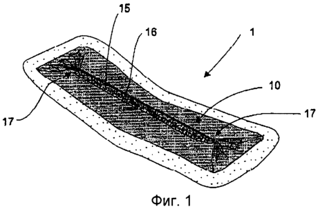 фиг.1 – перспективный вид предпочтительного варианта осуществления изобретения – гигиенической прокладки, изготовленной в соответствии с настоящим изобретением,