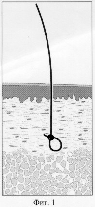Известны искусственные волосы BIOFIBRE [3], прошедшие биологические тесты и имеющие европейский и российский сертификаты на использование. Они выполнены из нетоксичных синтетических материалов, обладают хорошей механической сопротивляемостью, эластичностью, устойчивостью к атмосферным явлениям, поту, кислотам и моющим средствам. Каждый отдельный элемент волос представлен одиночной нитью, один конец которой предназначен для погружения в кожный покров. Первичную фиксацию его осуществляют завязыванием этого конца в узел в толще кожного покрова (фиг.1). Недостаток волос – низкая биосовместимость, частые (до 20% проведенных операций) послеоперационные осложнения: фолликулиты, гиперсекреция сальных желез, местная воспалительная реакция и, как результат, – выпадение имплантированных волос, т.е. рецидив алопеции. Манипуляционные действия хирурга при завязывании узлов скрупулезны и утомительны.