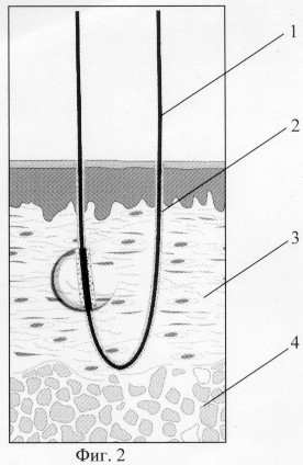 1 – внешний участок, 2 – внутрикожный участок с проницаемопористым поверхностным слоем, 3 – кожный покров, 4 – апоневроз.