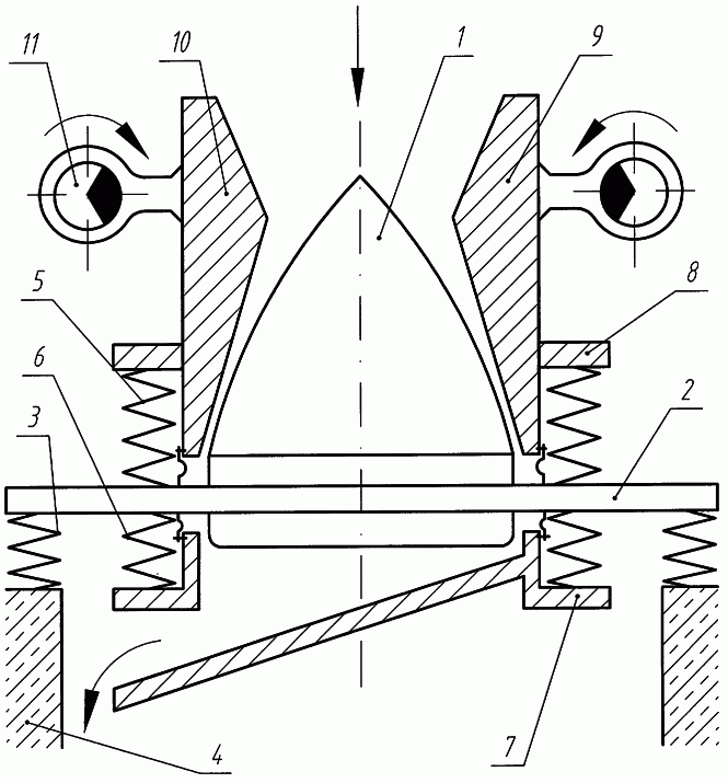 Пружины 5 и 6 фиксирует положение фланца 2 относительно корпуса 9 и обеспечивают стабильность взаимного перемещения конусов без боковых отклонений, что обеспечивает надежность работы дробилки. Отношение моментов инерции станины с внутренним конусом к корпусу с наружным конусом составляет равное или большее 4:1, что обеспечивает эффект ударного взаимодействия наковальни (внутренний конус – станина) и молота (корпус). В этом случае потери энергии от наличия упругого опирания станины на опору не превысит 10%. Если соотношение принять 3:1, то потери составят 20% и т.д. При соотношении 5:1 потери составят 8%, однако стоимость дробилки повысится на 20%. Принятое соотношение с точки зрения экономики оптимально. Таким образом, реализация отличительных признаков обеспечивает выполнение поставленной задачи.