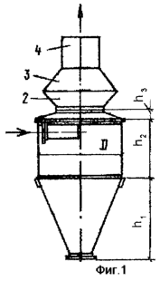 4. Циклон по п.1, отличающийся тем, что отношение высоты конической части корпуса циклона к высоте его цилиндрической части находится в оптимальном интервале величин: h1/h2=1,6÷1,8.