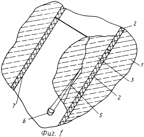На фиг.1 представлено устройство для осуществления способа очистки внутренней поверхности трубы от твердых наполнений. Момент образования скола под действием кумулятивной струи кумулятивного заряда при неполном перекрытии твердого наполнения.