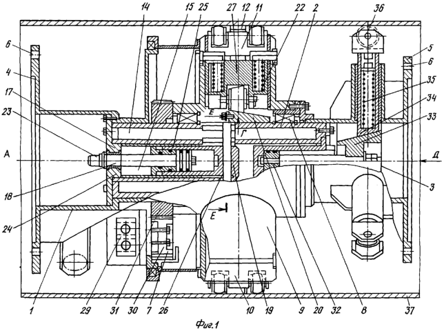 Шток 23 гидроцилиндра 18 жестко закреплен на крышке 24, скрепляющей левую внешнюю 1 и среднюю 2 части корпуса, а корпус 19 гидроцилиндра 18 имеет возможность осевого перемещения во втулке 25 и через штыри 26 скреплен с кольцевой втулкой 20.