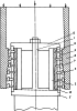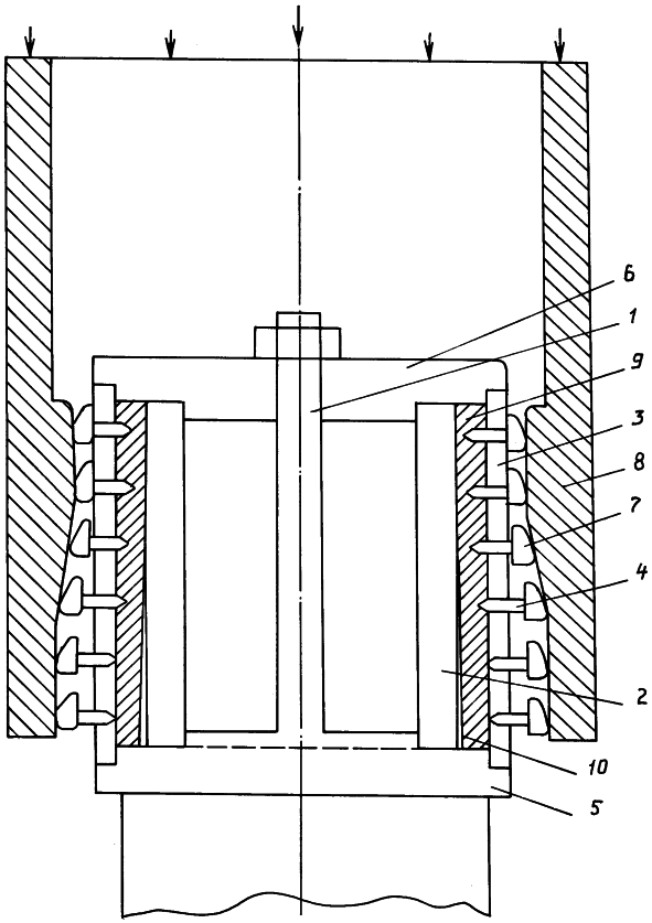 1 – центрирующую ось, 2 – сердечник с наружным диаметром dн.с., равным внутреннему номинальному диаметру новой втулки dвн.н, 3 – обойму с внутренним диаметром dвн.об.L, равным номинальному наружному диаметру альбомной втулки dн.н, в обойме имеются радиальные сквозные цилиндрические отверстия, служащие направляющими для инденторов 4, 5 – верхний и 6 – нижний центрирующие фланцы, 7 – инвенторы, 8 – цилиндрический пуансон с внутренней конической поверхностью, 9 – изношенная втулка с внутренним изношенным диаметром dвн.изн., зазор tзаз, равный половине разности диаметров внутреннего изношенной втулки и наружного сердечника, т.е.