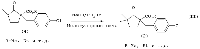 Кроме того, в выложенной заявке на патент Японии (KOKAI) №8-245517 описывается метод взаимодействия метилового эфира 1-[(4-хлорфенил)метил]-3-метил-2-оксоциклопентанкарбоновой кислоты с гидроксидом натрия и метилбромидом в присутствии молекулярных сит с целью получения 5-[(4-хлорфенил)метил]-2,2-диметилциклопентанона, как представлено следующей далее схемой реакции II):