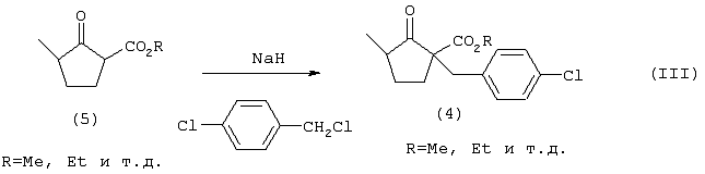 По третьему аспекту настоящего изобретения предлагается способ получения метилового эфира 1-[(4-хлорфенил)метил]-3-метил-2-оксоциклопентанкарбоновой кислоты или этилового эфира 1-[(4-хлорфенил)метил]-3-метил-2-оксоциклопентанкарбоновой кислоты, включающий: