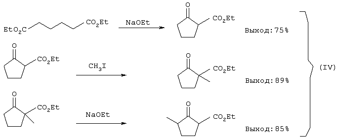 Полученный метиловый эфир 1-метил-2-оксоциклопентанкарбоновой кислоты подвергают реакции с метоксидом металла с тем, чтобы подвергнуть сложный метиловый эфир реакциям раскрытия кольца и конденсации с замыканием кольца, получая тем самым натриевую соль метилового эфира 3-метил-2-оксоциклопентанкарбоновой кислоты.