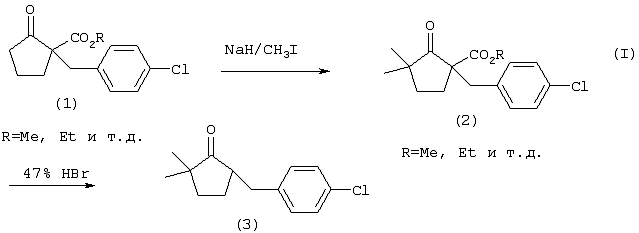 В выложенных заявках на патент Японии (KOKAI) №1-93574 и 1-301664 описывается 5-[(4-хлорфенил)метил]-2,2-диметилциклопентанон, и из него получают 5-[(4-хлорфенил)метил]-2,2-диметил-1-(1Н-1,2,4-триазол-1-илметил)циклопентанол (метконазол), превращая его карбонильную группу в эпоксигруппу и затем вводя в эпоксилированный продукт азолильную группу. В выложенной заявке на патент Японии (KOKAI) №1-93574 в качестве способа получения 5-[(4-хлорфенил)метил]-2,2-диметилциклопентанона описывается метод, представленный следующей далее схемой реакции (I)