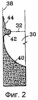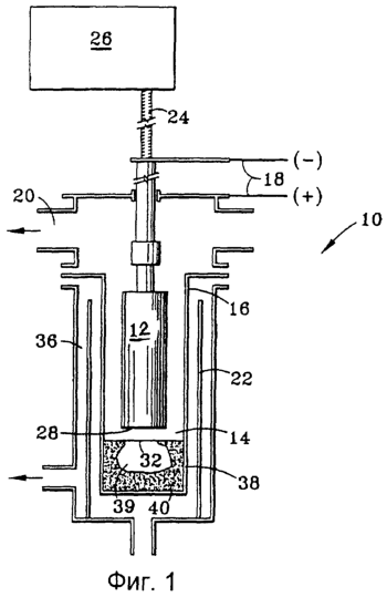 На фиг.1 схематично представлена печь 10 ВДП с частичным разрезом, а на фиг.2 схематично представлено сечение стенки 38 печного тигля, показывающее часть затвердевающего слитка. На фиг.1 и 2 легированный электрод 12 цилиндрической формы загружен в печную камеру 14 над водоохлаждаемым медным тиглем 16. Печь 10 содержит источник 18 постоянного тока, канал 20 для вакуумирования, направляющее средство 22 для охлаждающей воды, винт 24 привода для регулирования хода и систему 26 приводного двигателя для регулирования хода.