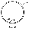 На фиг.3, 4, 5, 6 и 7 показана стенка 38 тигля, снабженная профилированной поверхностью 32 согласно изобретению. На фиг.3 схематично представлен вид сверху желобчатой стенки 38 тигля. На фиг.4 схематично представлены сечение стенки 38 тигля, профилированной поверхности 52 стенки тигля и затвердевающего слитка 40. На фиг.5 схематично представлена вертикальная проекция части желобчатой стенки 38 тигля. На фиг.6 схематично представлен вид сверху всей периферийной части тигля, где профилированная поверхность 52 снабжена вертикальными канавками 46. На фиг.7 схематично представлено сечение тигля 16, где профилированная поверхность 52 снабжена вертикальными канавками 46. На всех фигурах стенка 38 является профилированной, для того чтобы между закраиной и нижележащим слитком затвердевал удерживающий связующий элемент или ряд удерживающих элементов. Связующие предусмотрены для механической стабилизации закраины по мере того, как закраина оплавляется снизу и наращивается сверху. Застывающая профилированная поверхность слитка, которая является сопряженной с профилированной поверхностью 52 стенки, удерживает и механически стабилизирует закраину. Профилированная поверхность 52 также увеличивает отвод тепла от образующейся закраины благодаря увеличенной площади контакта между водоохлаждаемой медной [стенкой] и жидкой металлической ванной. Повышенный отвод тепла увеличивает толщину и прочность закраины и дополнительно стабилизирует закраину. Более толстая, поддерживаемая и более стабильная закраина сопротивляется внезапному разрушению и последующему загрязнению затвердевающего слитка.