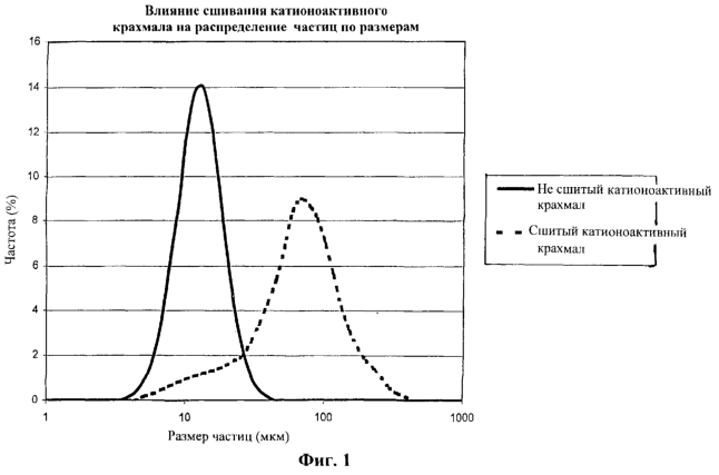 На фиг.1 показан график распределения частиц по размерам для примерных крахмалов на мокром конце, один из которых является сшитым, а другой – не сшитым.