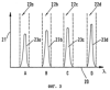 При перемещении под изображенным на фиг.4 измерительным устройством показанной, например, на фиг.2а банкноты 1a c меланжевыми волокнами типов А и В, люминесцентное излучение которых характеризуется наличием представленных на фиг.3 эмиссионных линий 23а, 23b, такое люминесцентное излучение воспринимается измерительными каналами датчика (детектора), сканирующими соответствующие им контрольные участки 8а, 8b, 8с, 8d, и преобразуется в сигналы показанной на фиг.5 формы.