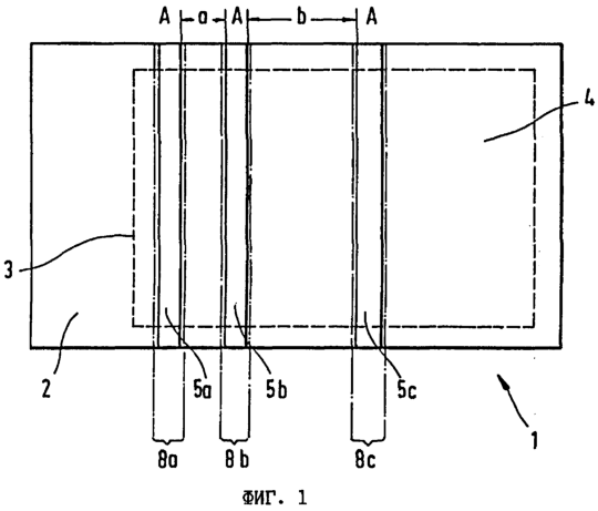 Расстояние между контрольными участками 8а и 8b обозначено буквой а, а расстояние между контрольными участками 8b и 8с обозначено буквой b, причем указанные расстояния а и b в данном случае не равны между собой. При этом соотношение между расстояниями а и b можно задавать, например, целочисленным. В пределах каждого из трех этих имеющих форму полосок контрольных участков 8а, 8b, 8с расположены имеющие форму полосок отдельные участки 5а, 5h, 5с, на которых в материал защищенной от подделки бумаги 2 заделаны меланжевые волокна. Границы таких имеющих форму полосок отдельных участков 5а, 5b, 5с обозначены на фиг.1 сплошными линиями. Такие сплошные линии, однако, показаны только в иллюстративных целях и на подлинном защищенном от подделки документе они отсутствуют.
