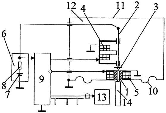 В момент появления тока эмиссии по сигналу с усилителя 9 электромагниты 4 и 5 меняют свое состояние: с тянущего электромагнита 5 снимается ток возбуждения, а фиксирующий электромагнит 4, притягивая к себе измерительный элемент 2, фиксирует его в новом положении. Продолжающееся перемещение чувствительного элемента 1 под действием упругой силы мембраны 10 вслед за перемещающимся контролируемым объектом 14 приводит к срыву тока автоэлектронной эмиссии (при расстоянии между измерительным 2 и чувствительным 1 элементами, равном + , где – величина гистерезиса автоэлектронной эмиссии), и процесс повторяется в последовательности, описанной выше.