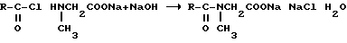 Пример 111,04 г (0,124 моль) саркозиновой кислоты добавляли к 104 г метанола, затем добавляли 26,8 г (0,124 моль) 25%-ного метоксида натрия. Полученную смесь нагревали с обратным холодильником в течение 15 минут и за это время раствор становился гомогенным. Добавляли одной порцией олеиновую кислоту и дистилляцией удаляли метанол. После того как метанол был удален полностью, температуру реакционной смеси повышали до 170oC. Через 4,0, 5,5 и 6,5 часов дополнительное количество саркозиновой кислоты добавляли в реакционную смесь и продолжали нагревание до 170oC. Реакционную смесь нагревали в целом в течение 8,5 часов, и полученное соотношение натрий-олеоил-саркозина и олеиновой кислоты составило 85:15, определенное методом HPLC с расчетом площадей пятен (хроматография высокого разрешения). Пример 2 В реактор, снабженный механической мешалкой, нагревающим кожухом и термометром, в атмосфере азота загружали 35,04 г (0,125 моль) олеиновой кислоты. Олеиновую кислоту нагревали до 80oC и добавляли 13,6 г (0,125 моль) твердого саркозината натрия. Полученную смесь нагревали до 170oС с постоянным барботированием азотом. Когда температура реакционной смеси достигала 170oC, добавляли 11,4 г (0,125 моль) саркозиновой кислоты в виде твердого вещества. Пробы реакционной смеси отбирали через 10 часов при 170oC и конверсия в расчете на олеиновую кислоту составила 84,2%. Неочищенную реакционную смесь растворяли в 60 г смеси изопропанола и воды (объемное соотношение 50/50). Полученный раствор подкисляли серной кислотой до pH 1. После подкисления в растворе получалось два слоя. Верхний слой, содержащий продукт, отделяли и концентрировали, в результате получали N-олеоил-саркозин. Пример 3 В реактор, снабженный механической мешалкой, нагревательным кожухом и термометром, в атмосфере азота загружали 35,4 г (0,125 моль) олеиновой кислоты. Олеиновую кислоту нагревали до 80oC и добавляли 13,8 г (0,125 моль) твердого саркозината натрия. Полученную смесь нагревали до 170oС при постоянном барботировании азотом. Когда температура реакционной смеси достигала 170oC, добавляли 22,8 г (0,250 моль) саркозиновой кислоты в виде твердого вещества. Пробы реакционной смеси отбирали через пять часов, и конверсия в расчете на олеиновую кислоту составила 92,5%. Пример 4 В трехгорлую круглодонную емкость емкостью 500 мл, снабженную механической мешалкой, термометром, входным и выходным отверстиями для продувки азотом, загружали 35,70 г (0,175 моль) лауриновой кислоты. При постоянном барботировании азотом лауриновую кислоту нагревали до 160oC и, как можно быстро, добавляли 19,40 г саркозината натрия и 15,90 г саркозиновой кислоты (0,175 моль). Полученную смесь затем нагревали до 170oC при постоянном барботировании азотом для удаления воды, образованной в процессе реакции. Пробы отбирали периодически для контроля исчезновения лауриновой кислоты. Через семь часов 93% лауриновой кислоты было превращено в продукты реакции. Пример 5 В трехгорлую круглодонную емкость емкостью 500 мл, снабженную механической мешалкой, термометром, входным и выходным отверстиями для продувки азотом, загружали 48,00 (0,175 моль) олеиновой кислоты. При постоянном барботировании азотом олеиновую кислоту нагревали до 160oC и по возможности быстро добавляли 8,60 г (0,088 моль) глицината натрия и 6,60 г (0,088 моль) глициновой кислоты. Полученную смесь затем нагревали до 170oC при постоянном барботировании азотом для