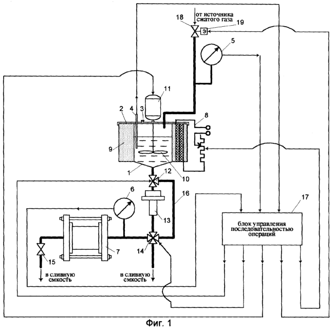 К входу блока управления 17 подключены датчик 4 температуры, датчики 5 и 6 давления, а выход соединен с управляемыми входами исполнительных механизмов привода мешалки 11, трех- и четырехходовых кранов 12 и 14, обогревателя 8.
