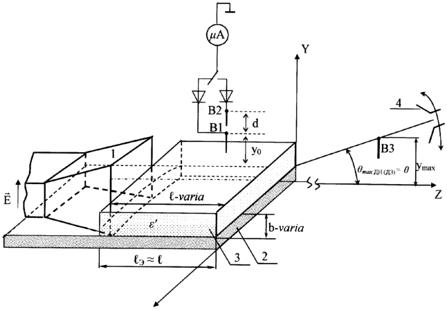 В качестве приемной части вместо вертикально ориентированного вибратора можно использовать рупорную апертуру – приемный рупор 4 (см. чертеж). В этом случае угол наклона максимума ДН будет соответствовать углу наклона приемного рупора 4, регистрируемому по максимуму электрического поля в нем.