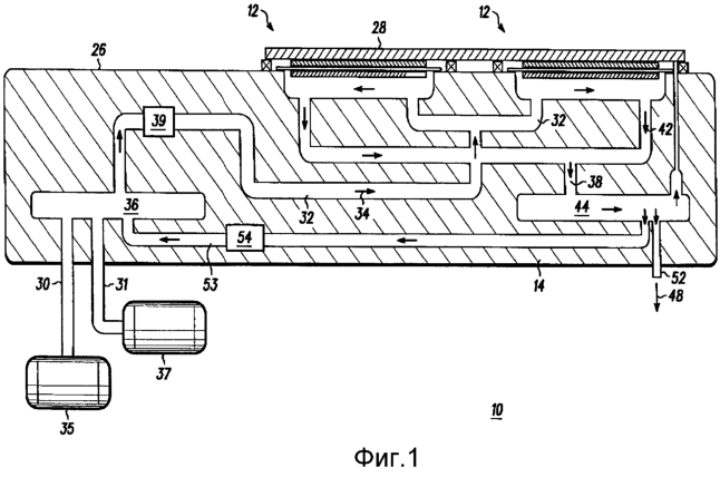 Кроме того, в основании 14 выполнен выпускной канал 38, сообщающийся с каждым из, по меньшей мере, двух разнесенных топливных элементов 12. Выпускной канал 38 служит для отвода продуктов 42 реакции, а именно двуокиси углерода и смеси вода/метанол, от топливных элементов 12. Во время работы продукты реакции разделяются в камере 44 сепарации двуокиси углерода на смесь 46 вода/метанол и на двуокись углерода в виде газа 48. Далее, газ 48 выводится через выпускное отверстие 52, например, через газопроницаемую мембрану, а смесь 46 вода/метанол возвращается по рециркуляционному каналу 53, частью которого является насос 54, например насос MEMS, или обратный клапан, в смесительную камеру 36. Кроме того, газопроницаемая система 56 регенерации воды находится в микрофлюидном сообщении с возвратным каналом 58 регенерации воды. Система 56 регенерации воды служит для улавливания воды с катодных сторон топливных элементов 12 и направления ее по возвратному каналу 58, как показано. Возвратный канал 58 находится в микрофлюидном сообщении с сепарационной камерой 44 и, в конечном итоге, со смесительной камерой 36.