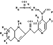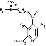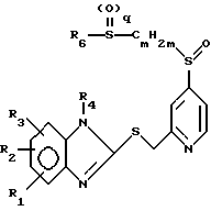 Изобретение относится к соединениям, которые должны применяться в фармацевтической промышленности в качестве биологически активных веществ для получения лекарственных средств. Известный уровень техники В европейской патентной заявке 150586 закрываются 2-(пиридилметилтио-, соответственно, -сульфинил) бензимидазолы, которые в пиридиновой части молекулы в положении 4, среди прочего, могут быть замещены алкилтио- или арилтиоостатками. Для описанных соединений указывается длительное подавление выделения кислоты желудочного сока. В международной патентной заявке ВОИС-89/03830 описывается, что те же самые, а также другие подобные по структуре соединения должны быть пригодны для лечения остеопороза. В международной патентной заявке ВОИС -92/12976 описываются определенным образом замещенные 2-(пиридилметилтио-, соответственно, -сульфинил) бензимидазолы, которые должны быть эффективны против Helicobacter – бактерий, и далее для них раскрыто, что они должны быть пригодны для предотвращения и лечения целого ряда заболеваний желудка. Описание изобретения Предметом изобретения являются соединения формулы (I) (см. прилагаемый формульный лист), где R1 обозначает водород, (C1-C4)-алкил или (C1-C4)-алкоксил; R2 обозначает водород, (C1-C4)-алкил, (C1-C4)-алкоксил, галоген, трифторметил, полностью или преобладающе замещенный фтором (C1-C4)-алкоксил, хлордифторметокси-группу, 2-хлор-1,1,2-трифторэтокси-группу или вместе с R3 при желании обозначает целиком или частично замещенную фтором (C1-C2)-алкилендиокси- или хлортрифторэтилендиокси-группу; R3 обозначает водород, полностью или преобладающе замещенный фтором (C1-C4)-алкоксил, хлордифторметокси-группу, 2-хлор-1,1,2-трифторэтокси-группу или вместе с R2 при желании обозначает целиком или частично замещенную фтором (C1-C2)-алкилендиокси- или хлортрифторэтилендиокси-группу; R4 обозначает водород, (C1-C4)-алкил; R5 обозначает водород, (C1-C4)-алкил или (C1-C4)- алкоксил; R6 обозначает замещенный с помощью R8 и R9 цикл или бицикл, который выбирает из группы, состоящей из бензола, фурана, тиофена, пиррола, оксазола, изоксазола, тиазола, тиазолина, изотиазола, имидазола, имидазолина, пиразола, триазола, тетразола, тиадиазола, оксадиазола, пиридина, пиpидин-N-oкcидa, пиримидина и бензимидазола; R7 обозначает водород, (C1-C4)-алкил или (C1-C4)-алкоксил; R8 обозначает водород, (C1-C4)-алкил, гидроксил, (C1-C4)-алкоксил, галоген, нитро-группу, карбоксил, (C1-C4)-алкоксикарбонил, гуанидино-группу, замещенный с помощью R10 (C1-C4)-алкил или -N(R11)R12; R9 обозначает водород, (C1-C4)-алкил, (C1-C4)-алкоксил, фтор или трифторметил; R10 обозначает гидроксил, (C1-C4)-алкоксил, карбоксил, (C1-C4)-алкоксикарбонил или -N(R11)R12, причем R11 обозначает водород, (C1-C4)-алкил или -CO- R13 и R12 обозначает водород или (C1-C4)-алкил, или причем R11 и R12 вместе и при включении атома азота, с которым оба связаны, представляют собой пиперидиновый или морфолиновый остаток; R13 обозначает водород, (C1-C4)-алкил или (C1-C4)-алкоксил; “m” обозначает число 2 – 7; “n” обозначает число 0 или 1; “p” обозначает число 0 или 1 и “q” обозначает число 0 или 1 и их соли; (C1-C4)-алкил обозначает линейные или разветвленные алкильные остатки с 1-4 C-атомами. В качестве примера следует назвать бутильный, изобутильный, втор. -бутильный, трет. -бутильный, пропильный, изопропильный, этильный и метильный остаток. (C1-C4)-алкоксил обозначает остаток, который наряду с атомом кислорода содержит о