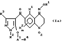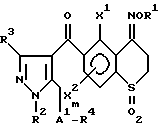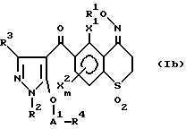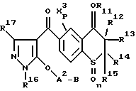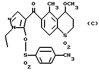 Соединения 28 и 29 получают по методике, описанной в Примере 26, за исключением того, что исходное соединение заменяют на 4- метоксиимино-5,8-диметил-6-(1-этил-5-гидрокси-пиразол-4- ил)карбонилтиохроман-1,1-диоксид и в качестве реакционных реагентов используют фенацилбромид и бензилбромид.
