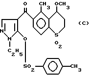 4-Метоксиимино-5,8-диметил-6-(1-этил-n-толуолсульфонил- оксипиразол-4-ил)карбонилтиохроман-1,1-диоксид (соединение 3) получают с выходом 42% по методике, аналогичной методике, описанной в примере 1, за исключением того, что исходное соединение заменяют на 4-метоксиимино-5,8-диметил-6-(1-этил- 5-гидроксипиразол-4-ил)карбонилтиохроман-1,1-диоксид и в качестве реакционного реагента используют n-толуолсульфонилхлорид.