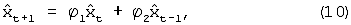Расчет коэффициентов автокорреляции осуществляется на основе использования значений времени прихода хt единиц трафика на интервале наблюдения. Нормированные значения автокорреляционной функции поступают на блок расчета параметров авторегрессии, где согласно уравнений системы 9 производится вычисление параметров авторегрессии вышеописанным раннее способом. Полученные значения параметров авторегрессии поступают на вход “р” блока фильтра авторегрессии порядка р=2 и являются весовыми коэффициентами данного фильтра.