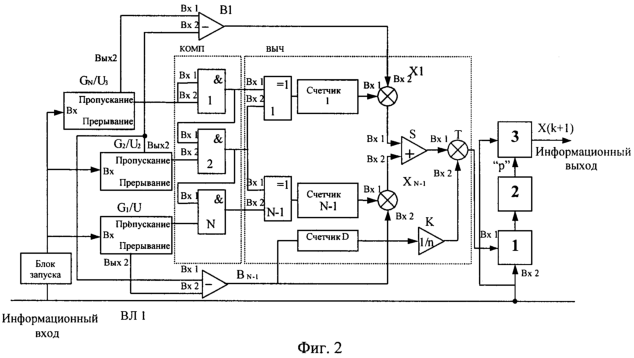 Сигналы с выхода умножителей подаются на вход сумматора S. В сумматоре производится сложение величин, полученных с выхода умножителей X(1…N-1). Полученный результат поступает на первый вход умножителя Т. Одновременно импульсы с выхода блока запуска поступают на счетчик D. В счетчике D производится подсчет числа единичных символов “1”, общее количество которых n будет равно количеству пришедших единиц трафика на интервале наблюдения. После поступления каждого единичного импульса на интервале наблюдения, значение счетчика увеличивается на единицу. Сигнал с выхода счетчика D поступает на вход делителя К. В делителе выполняется операция деления на число n, то есть производится вычисление: 1/n. С выхода делителя К сигнал поступает на второй вход умножителя Т, в котором производится заключительный расчет математического ожидания времени прихода единиц трафика на интервале наблюдения (выражение 4). Здесь: