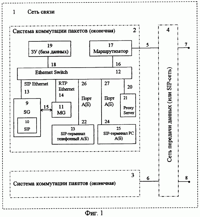 В состав каждой из систем 2, 3 коммутации пакетов входят аппаратно-программные средства, в том числе сигнальный шлюз 9 SG с протоколом 10 пакетной передачи информации Session Initialization Protocol (SIP) или модификацией этого протокола, медиа-шлюз 11 MG, коммутатор 12 локальной вычислительной сети (ЛВС) – Ethernet Switch. В состав программных средств входят также протокол реального времени RTP и транспортный протокол реального времени RTCP (на фиг.1 эти протоколы отдельно не выделены, а входят в состав сигнального шлюза 9 SG и медиа-шлюза 11).