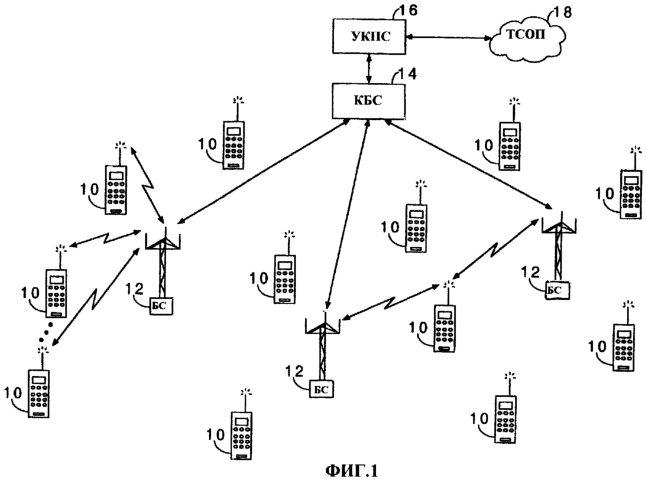 Как показано на фиг.1, система радиотелефонной связи МДКР содержит в основном множество подвижных абонентских аппаратов (станций) 10, множество базовых станций 12, контроллеры базовых станций (КБС) 14 и узел коммутации подвижной связи (УКПС) 16. УКПС 16 выполнен с возможностью сопряжения с обычной телефонной сетью общего пользования (ТСОП) 18. УКПС 16 также выполнен с возможностью сопряжения с КБС 14. КБС 14 подключены к базовым станциям 12 через ретрансляционные линии. Ретрансляционные линии могут быть выполнены с возможностью поддержки любого из нескольких известных интерфейсов, включая, например, Е1/Т1, АТМ, IP, PPP, Frame Relay, HDSL, ADSL или xDSL. Понятно, что в системе может быть более двух КБС 14. Каждая базовая станция 12 преимущественно содержит по меньшей мере один сектор (не показан), каждый сектор содержит всенаправленную антенну или антенну, ориентированную в конкретном радиальном направлении от базовой станции 12. Альтернативно, каждый сектор может содержать две антенны для разнесенного приема. Каждая базовая станция 12 может быть предпочтительно выполнена с возможностью поддержки нескольких частотных диапазонов. Пересечение сектора и частотного диапазона может называться каналом МДКР. Базовые станции 12 могут также называться приемопередающими подсистемами базовой станции (ППБС) 12. Альтернативно, понятие “базовая станция” может использоваться в данной области техники для обозначения совокупности КБС 14 и одной или нескольких ППБС 12. ППБС 12 могут также называться “сотовыми узлами” 12. Альтернативно, сотовыми узлами могут называться отдельные сектора данной ППБС 12. Подвижные абонентские аппараты 10 обычно являются сотовыми телефонами или аппаратами ПСС 10.