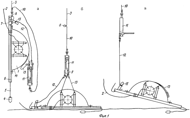 После проведения необходимых исследований с помощью ГАИС на управляемый расцепитель буя с надводного центра подают командный сигнал. При этом буй положительной плавучести (на чертеже не показан) всплывает и поднимает несущий трос 3 на поверхность натурного водоема.