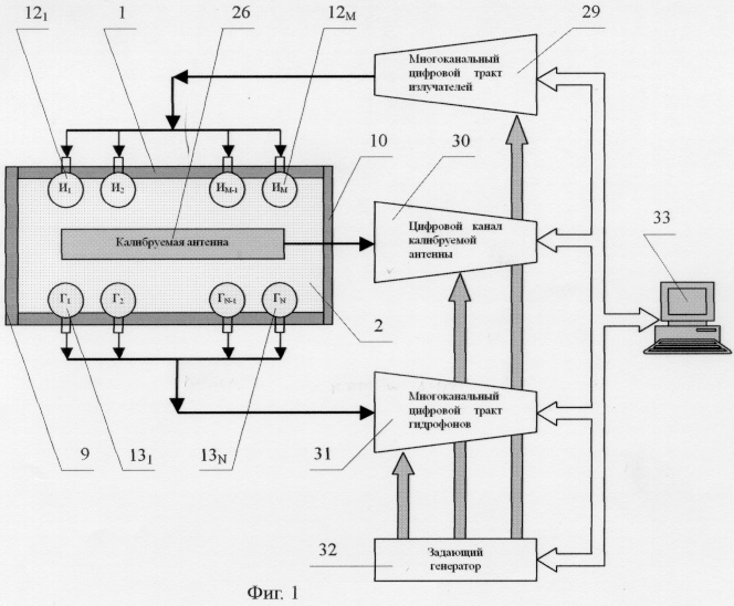 Выждав время, необходимое для адаптации излучателей, гидрофонов и антенны к установленному гидростатическому давлению, в гидрокамере создается акустическое поле, используя, например, известный способ [2] моделирования гидроакустических полей. Для этого предварительно созданная компьютерная программа рассчитывает амплитуды и фазы выходных сигналов МЦТИ 29, значения которых цифровыми кодами задаются в МЦТИ 29. Также программируется ЗГ 32 на генерацию сигналов заданной частоты. Выходные сигналы МЦТИ 29 поступают в излучатели 13, которые и создают в гидрокамере требуемое акустическое поле. Выходные сигналы гидрофонов 13 и калибруемой антенны 26 поступают на МЦТГ 31 и ЦККА 30 соответственно, где преобразуются в цифровые коды, которые поступают в компьютер 33. Компьютерная программа анализирует цифровые коды, соответствующие выходным сигналам гидрофонов, и если принимается решение о возможности проведения измерений, то с этими кодам проводят вычисления, необходимые для проведения калибровки антенны.