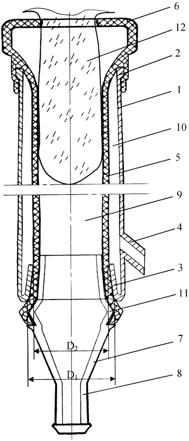 Двухкамерный доильный стакан содержит цилиндрический корпус 1, имеющий снаружи в верхней части кольцевое утолщение 2. В нижней части корпус 1 имеет углубление 3 в форме усеченного конуса высотой 0,5…0,7 диаметра его нижнего основания Д1. Верхнее (меньшее) основание конуса с диаметром Д2 направлено вверх, при этом . Диаметр сосковой трубки равен или меньше верхнего основания конуса Д2. Размеры корпуса 1 и сосковой трубки 5 стандартные. Надежность фиксации смотрового конуса в корпусе и герметизации межстенной 10 и подсосковой камер 9, что повышает качество доения, обеспечивается указанными соотношениями размеров конусообразного углубления. На корпусе 1 расположен патрубок переменного вакуума 4, а внутри корпуса 1 – сосковая трубка 5 с присоском 6. В сосковую трубку 5 снизу вставлен смотровой конус 7 с буртиком 11 из прозрачного материала, например, из оргстекла, до упора в коническую поверхность углубления 3 корпуса стакана через резину сосковой трубки 5. Смотровой конус 7 заканчивается патрубком постоянного вакуума 8. При надетом на сосок 12 доильном стакане под соском образуется подсосковая камера 9. Между соковой трубкой 5 и корпусом 1 образована межстенная камера 10. Сосковая трубка 5 при сборке, растягиваясь, проходит усеченный конус углубления 3 и выходит за пределы корпуса 1, обхватывая снаружи верхнюю часть смотрового конуса 7, включая его расширенный буртик 11. При ослаблении натяжения сосковая трубка 5 сокращается и упирается вместе с частями смотрового конуса 7 в стенки углубления 3 корпуса 1, надежно фиксируется и герметизирует подсосковую камеру 9 доильного стакана в нижней части. А присосок 6 сосковой трубки 5 вместе с кольцевым утолщением 2 в верхней части корпуса 1 герметизирует межстенную камеру 10 доильного стакана в верхней части. Доильный стакан собирается и разбирается с помощью монтажного стержня (заявка на изобретение №2002122010/023122 от 22.08.2001 г.).