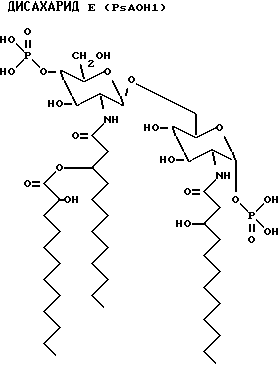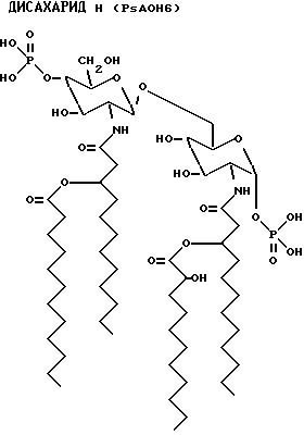 (1 6) глюкозаминовый дисахарид, имеющий общую формулу (см. формулу I в тексте описания)где R1 представляет гидроксильную группу, дигидроксифосфоноилоксигруппу или ее заряженные формы, (C1 – C5)ацилоксигруппу, (C1 – C5)алкилоксигруппу или группу Х; R2 и R’2 каждый являются ацильной группой или группой Y при условии, что, по крайней мере, R2 и R’2 являются группой Y; R3 и R’3 каждый представляет водород, (C1 – C3)алкильную группу или (C1 – C3)ацильную группу; R4 представляет водород, (C1 – C3)алкильную группу или (C1 – C3)ацильную группу; R’4 представляет водород, (C1 – C5)ацильную группу, (C1 – C5)алкильную группу или фосфоногруппу или ее заряженные формы; R’6 представляет водород, гидроксильную группу или группу Z; где группа Х выбрана из группы, включающей карбокси (C1 – C4)алкоксигруппу; -O-CH-[(CH2)mCOOH][(CH2)nCOOH] группу, где m = 0 – 5, n = 0 – 5; и заряженные формы группы Х; где группа Y выбрана из группы, включающей ацилоксиацильную группу, (C1 – C24)алкилоксиацильную группу; где группа Z выбрана из группы, включающей 3-дезокси-D-манно-2-октулосоновую кислоту (KDO); (KDO)n, где n = 1 – 10; полисахаридную цепь, такую, как боковая цепь из натурального полисахарида; компонент ядра, такой, как компонент, происходящий из натурального липополисахарида; или их соли. 2. Дисахарид по п.1, где группа Y включает 3-ацилоксиацильную группу. 3. Дисахарид по п.1 или 2, где группа Y представляет ацилоксиацильную группу. 4. Дисахарид по пп.1 – 3, где ацильная группа является остатком жирной кислоты, остатком 3-гидроксижирной кислоты, остатком 3-оксожирной кислоты. 5. Дисахарид по пп.1 – 4, где ацилоксиацильная группа, образующая группу Y, включает в себя ацильные радикалы, выбранные из группы, включающей остаток жирной кислоты, остаток 3-гидроксижирной кислоты, остаток 3-оксожирной кислоты. 6. Дисахарид по пп. 3 – 5, где группа Y представляет ацилоксиацильную группу, которая является N-присоединенным 3-гидрокси(C4 – C24)ацилом, предпочтительно (C8 – C18)ацилом жирной кислоты, эфироприсоединенным по 3-гидроксиположению к (C1 – C20)ацилу, предпочтительно к (C10 – C18)ацилу жирной кислоты. 7. Дисахарид по п.6, где ацилоксиацильная группа является N-присоединенным 3-гидроксиC14-ацилом жирной кислоты, эфироприсоединенным по 3-гидроксиположению к C12-жирной кислоте. 8. Дисахарид по п.6, где ацилоксиацильная группа является N-присоединенным 3-гидроксиC14-ацилом жирной кислоты, эфиро-присоединенным по 3-гидроксиположению к C14-жирной кислоте. 9. Дисахарид по пп.1 – 8, где R’2 является группой Y. 10. Дисахарид по пп.1 – 8, где R2 является группой Y. 11. Дисахарид по пп.1 – 10, где остаток 3-гидроксижирной кислоты является 3-гидрокси(C4 – C24)-, предпочтительно 3-гидрокси(C10 – C18)-жирной кислотой. 12. Дисахарид по п. 11, где остаток 3-гидроксижирной кислоты является 3-гидроксиC14-жирной кислотой. 13. Дисахарид по п.11 или 12, где R2 является остатком 3-гидроксижирной кислоты. 14. Дисахарид по п.11 или 12, где R’2 является остатком 3-гидроксижирной кислоты. 15. Дисахарид по пп.1 – 10, где и R2 и R’2 оба являются группой Y. 16. Дисахарид по п. 15, где R2 и R’2 представляют ацилоксиацильную группу, включающую N-присоединенный 3-гидрокси(C4 – C24)ацил, предпочтительно (C8 – C18)ацил жирной кислоты, эфироприсоединенный по 3-гидроксиположению к (C1 – C20)ацилу, предпочтительно (C10 – C18)ацилу жирной кислоты. 17. Дисахарид по п. 16, где R2 является N-присоединенным 3-гидроксиC14-ацилом жирной кислоты, эфироприсоединенным по 3-гидрокси