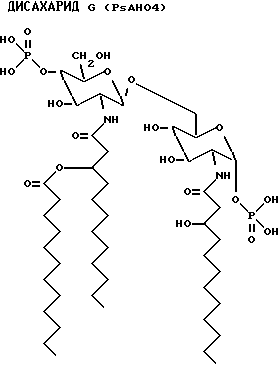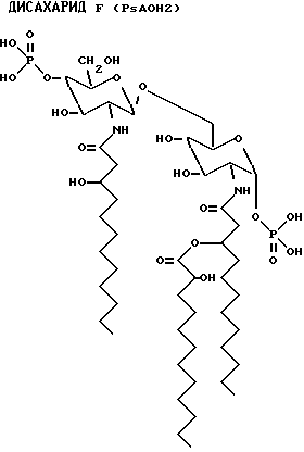 Однако N-присоединенный заместитель может являться также ацилоксиацильной группой, определенной выше, и содержащей N-присоединеннный 3-гидрокси(C14-C24)ацил жирной кислоты, который эфирно-связан по 3- гидроксиположению с (C1-C20)карбоновой кислотой, предпочтительно, предпочтительно 3-гидрокси(C8-C18) жирной кислоты, эфирно-связанный по 3-гидроксиположению с (C10-C18) -жирной кислотой. Более предпочтителен дисахарид, где R2 является N-присоединеннным 3-гидрокси C14-ацилом жирной кислоты, эфирно-связанным по 3-гидроксиположению с C12-жирной кислотой или C16-жирной кислотой, и где R2 является N-присоединеннным 3-гидроксиC14-ацилом жирной кислоты, эфирно-связанным по 3-гидроксиположению с C12-жирной кислотой и C14-жирной кислотой.
