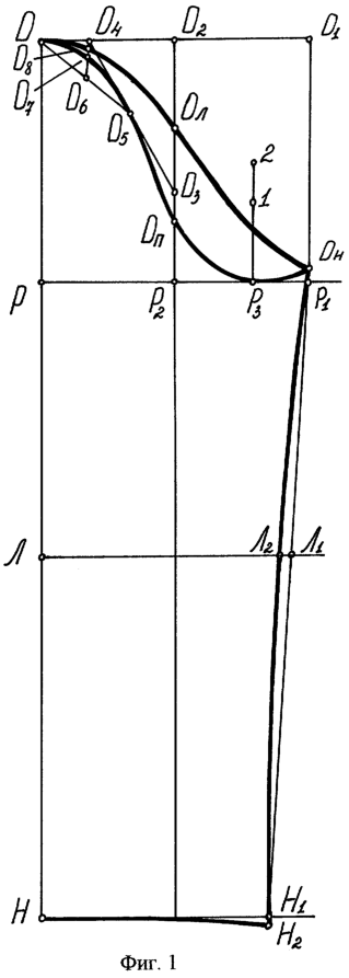 Проводят две взаимно перпендикулярные линии с пересечением в точке Р (фиг.1). Рассчитывают ширину оката рукава по выражению 0,5·(Оп+Поп), где Оп – это обхват плеча фигуры, Поп – прибавка к обхвату плеча, и длину полученного отрезка откладывают вправо от точки Р, получают точку P1. Рассчитывают радиус по уравнению (0,5+к)-ДП+а-в и проводят дугу данным радиусом из точки P1 до пересечения в точке О с вертикалью, проведенной через точку Р, ОР – высота оката рукава. Строят прямоугольник OPP1O1, через середину отрезка ОО1 проводят вертикальную линию О2Р2 вниз до пересечения с горизонталью PP1 в точке Р2.