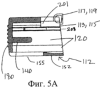 Зажим 112 также содержат смещающий механизм зацепления для соединения зажимов 112 и 114, стремящийся отталкивать зажим 112 от зажима 114. В варианте выполнения, показанном на фиг.5А, данный механизм содержит стойку 140 пружины, которая подсоединена к центру внутренней тыльной стенки нижнего канала и выступает в нижний канал, в целом параллельно нижней стенке приблизительно на одну четверть расстояния между тыльной и передней сторонами зажима 112. Вокруг стойки 140 расположена пружина.