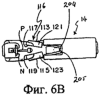 При полном сжатии картриджа 14 происходит прокалывание уха, а штырь серьги Р сцепляется с гайкой N. Затем давление руки на картридж 14 (или на заряжаемый картриджем серьги пистолет для пуссет) ослабляют, половинки 113 и 115 картриджа серьги для пирсинга ушей открываются вверх по направлению от серьги Е для пирсинга ушей, гайка N серьги для пирсинга ушей отсоединяется от зажима 114 для гайки, ухо уже проколото, и затем пистолет для пуссет с картриджем серьги может быть удален вместе с картриджем серьги из области, прилегающей к проколотому уху. Вследствие того что осуществляется удержание оконечных частей 125 и 127, как показано на фиг.6С, половинки 113 и 115 держателя пуссеты не выпадают и тем самым предотвращают повторную загрузку картриджа, нарушающую стерильность. То есть, прямоугольные выступы на концах оконечных частей 125 и 127 удерживают половинки картриджа 113 и 115 с предотвращением их выпадения для того, чтобы предотвратить повторную загрузку пуссеты и повторное использование картриджа серьги.