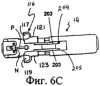 Работу картриджа серьги можно понять при обращении к фиг.6А и 6С. Обычно пружина картриджа серьги или другое смещающее устройство отталкивает зажим для гайки от зажима для серьги настолько, насколько это позволяют нижний паз и язычок с крючком. Между зажимом для гайки и зажимом для серьги предусмотрено достаточное пространство для помещения в него уха, которое подвергается прокалыванию. После помещения уха между зажимом для гайки и зажимом для серьги и, обязательно, между пуссетой серьги или штырем Р и гайкой N серьги, картридж 14 сжимают вручную или, например, посредством сдавливания описанного ниже заряжаемого картриджем серьги пистолета для пуссет, в который может быть помещен картридж серьги. Сжатие картриджа 14 переносит основание L-образных оконечных элементов 203 над бугорком, вызывая приложение вращающего усилия к обеим половинам узла 116.