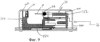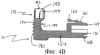 Верхний упор-ограничитель 30 имеет L-образную форму (в поперечном сечении) для размещения подвижной части 40 гнезда 74, предусмотренного для картриджа 14 в пистолете 12. Подвижная часть 40 имеет свисающий выступ 42, который вставлен в паз 44, выполненный между верхним упором-ограничителем 30 и поршнем 22. Язычок 46 выступает вперед в поперечном направлении от поршня 22 и служит, как это будет видно, дополнительным ограничителем перемещения. Задний упор 48 гнезда служит для того, чтобы обеспечить поддерживающую опору и упор задней части картриджа 14 после того, как он вставлен в пистолет 12, а более точно, в гнездо 74 пистолета.